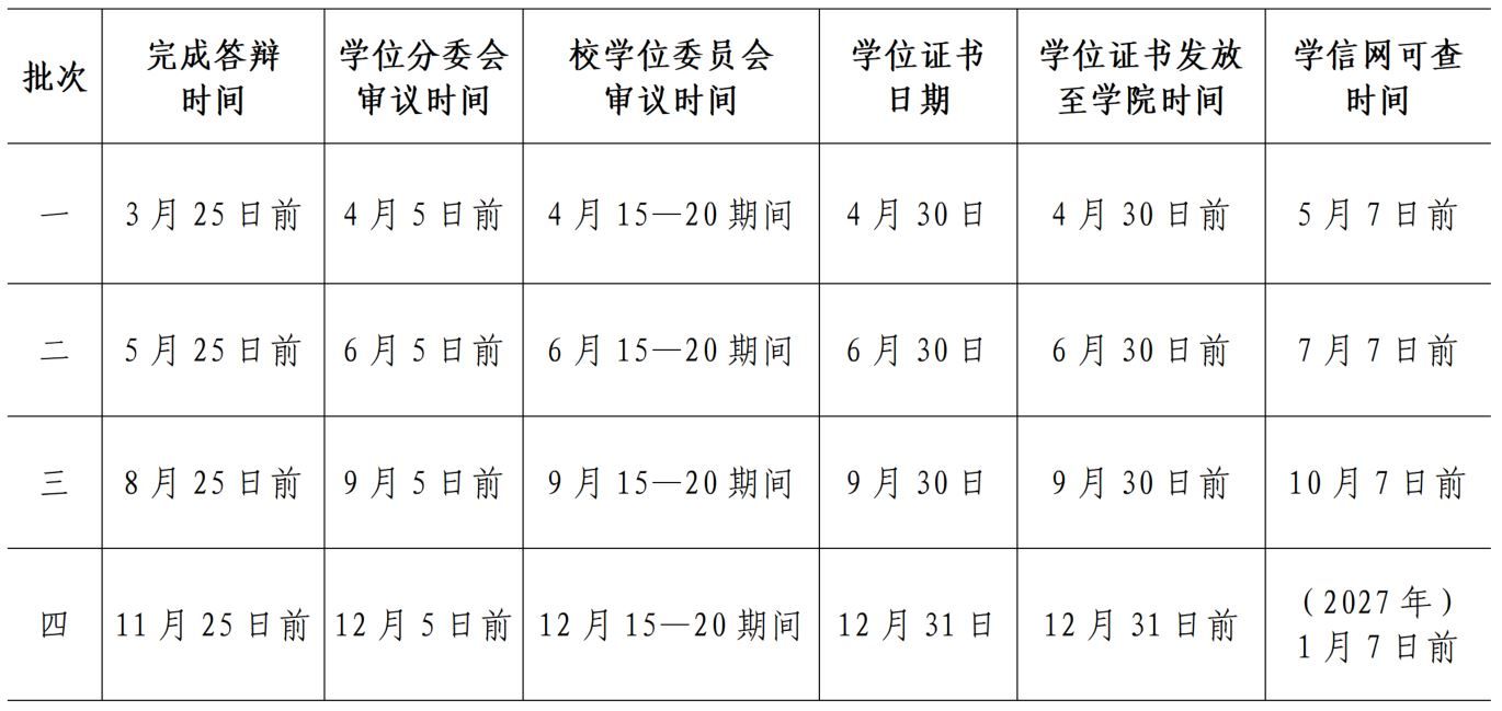 根据《同济大学学位授予工作细则》有关规定,为规范有序做好学校2026年学位授予工作,便于各培养单位组织好全年学位申请工作、各学位申请人合理安排好学业计划,现就2026年硕士博士学位授予审核批次公布如下: